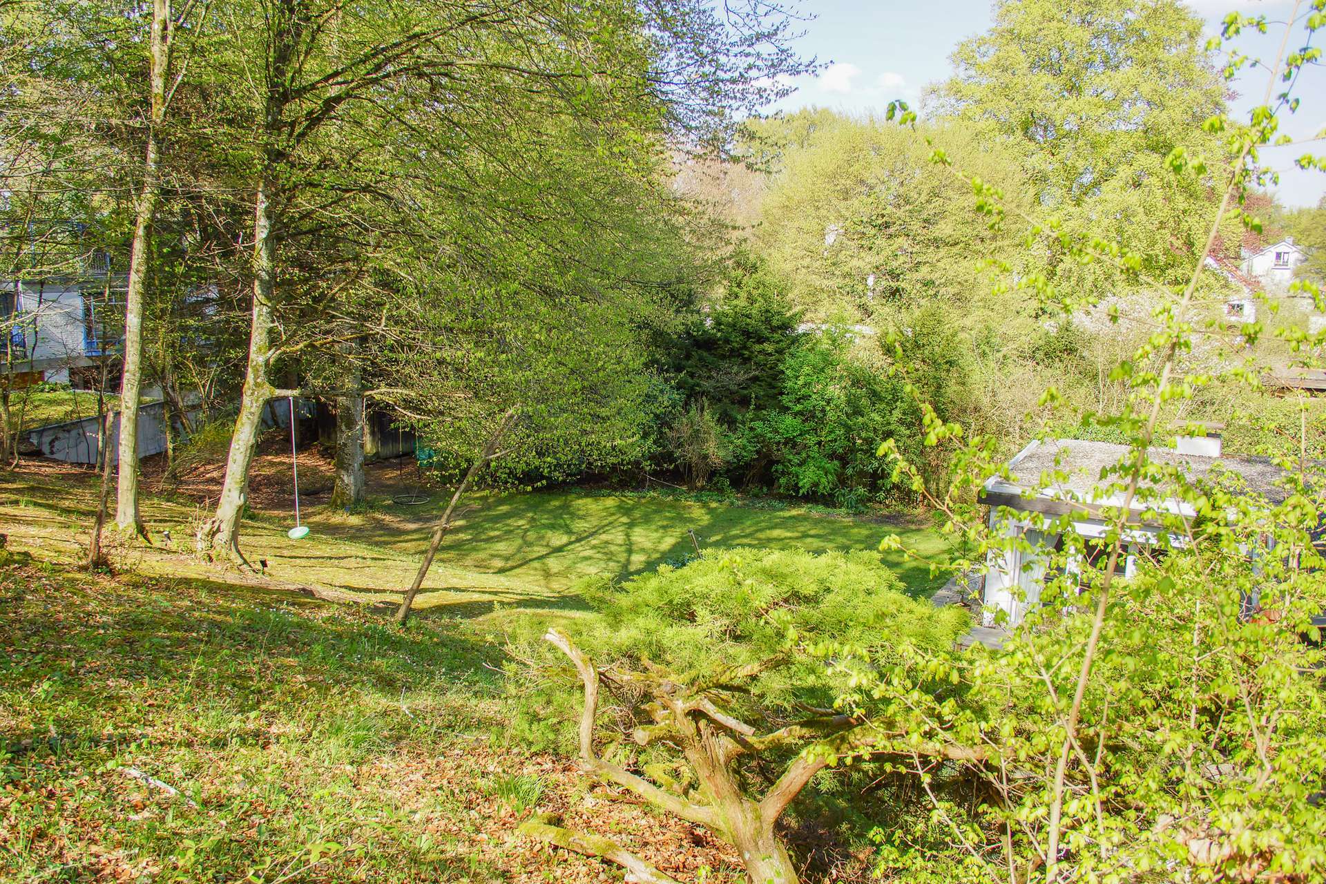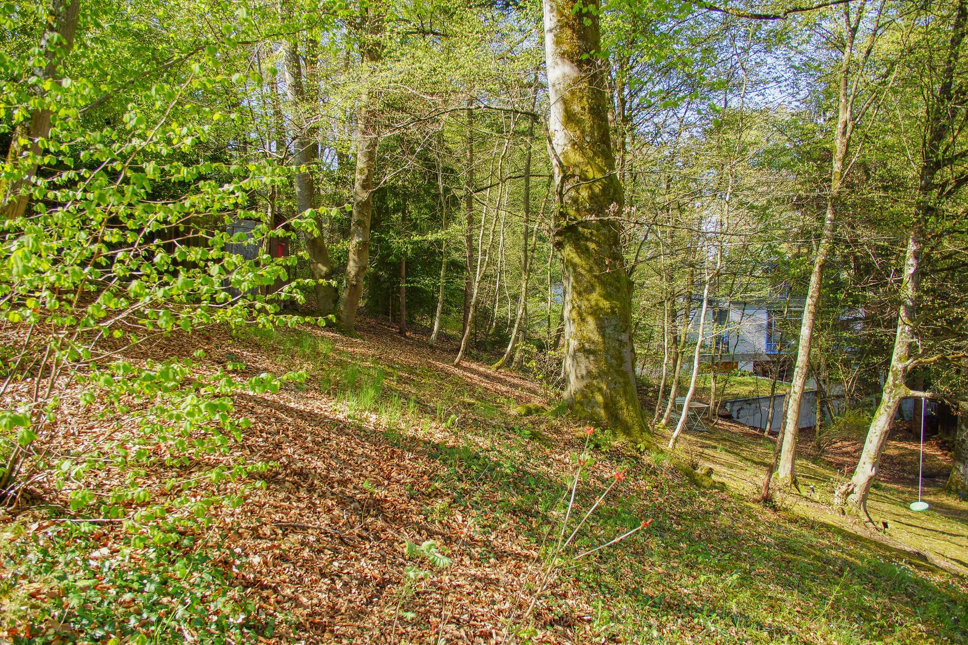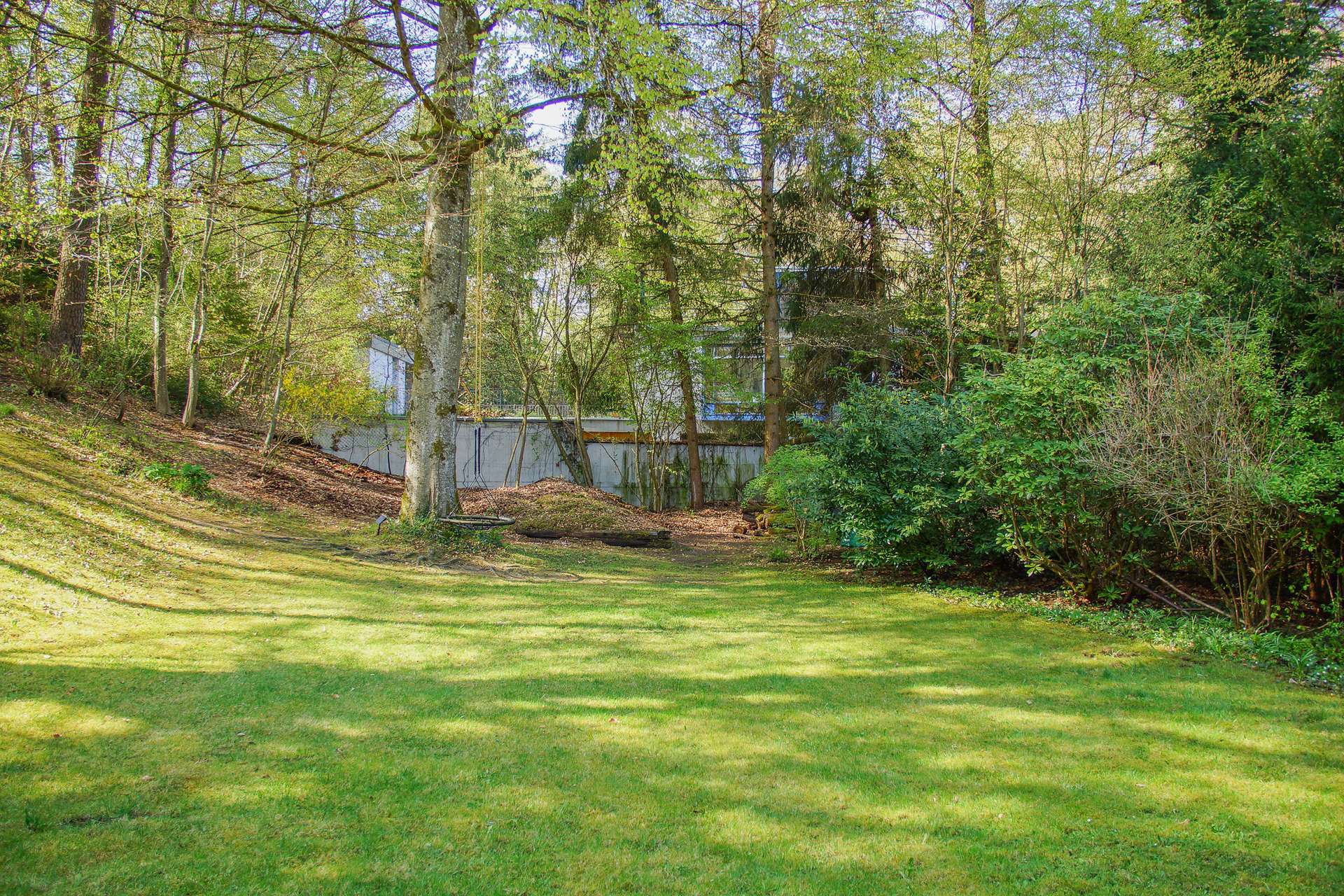 Besonders reizvoll ist die charaktervolle Topografie des Grundstücks: Die Hanglage schafft eine spannende Struktur mit verschiedenen Ebenen, Terrassen und einer besonders geschützten Atmosphäre. Gleichzeitig bietet eine großzügige, ebene Fläche ausreichend Platz für einen Garten mit Pool oder Spielfläche für Kinder. Die Ausrichtung sorgt für viel Sonne in den Nachmittags- und Abendstunden, während die Morgensonne sanft durch den Buchenhain gefiltert wird.