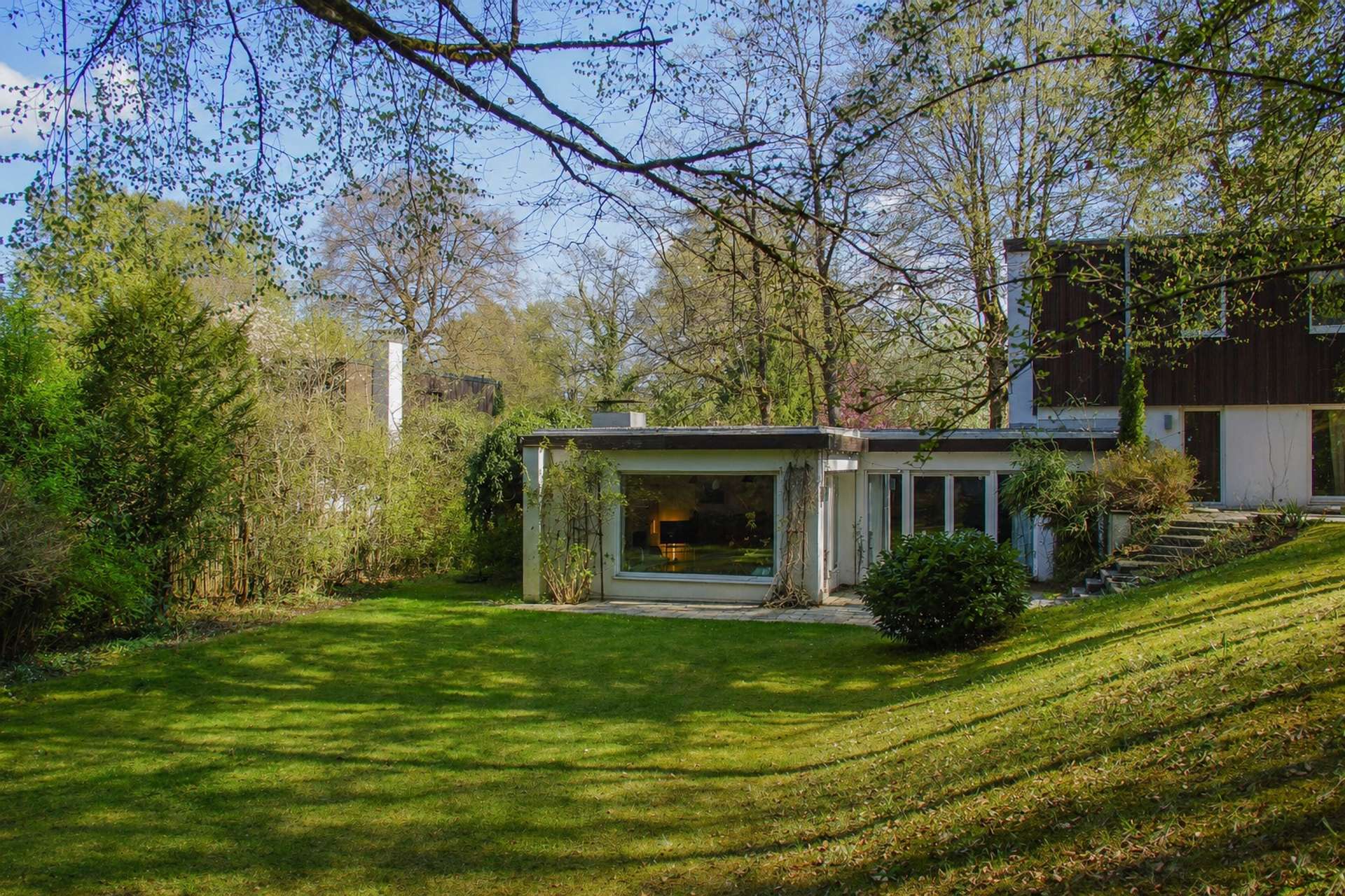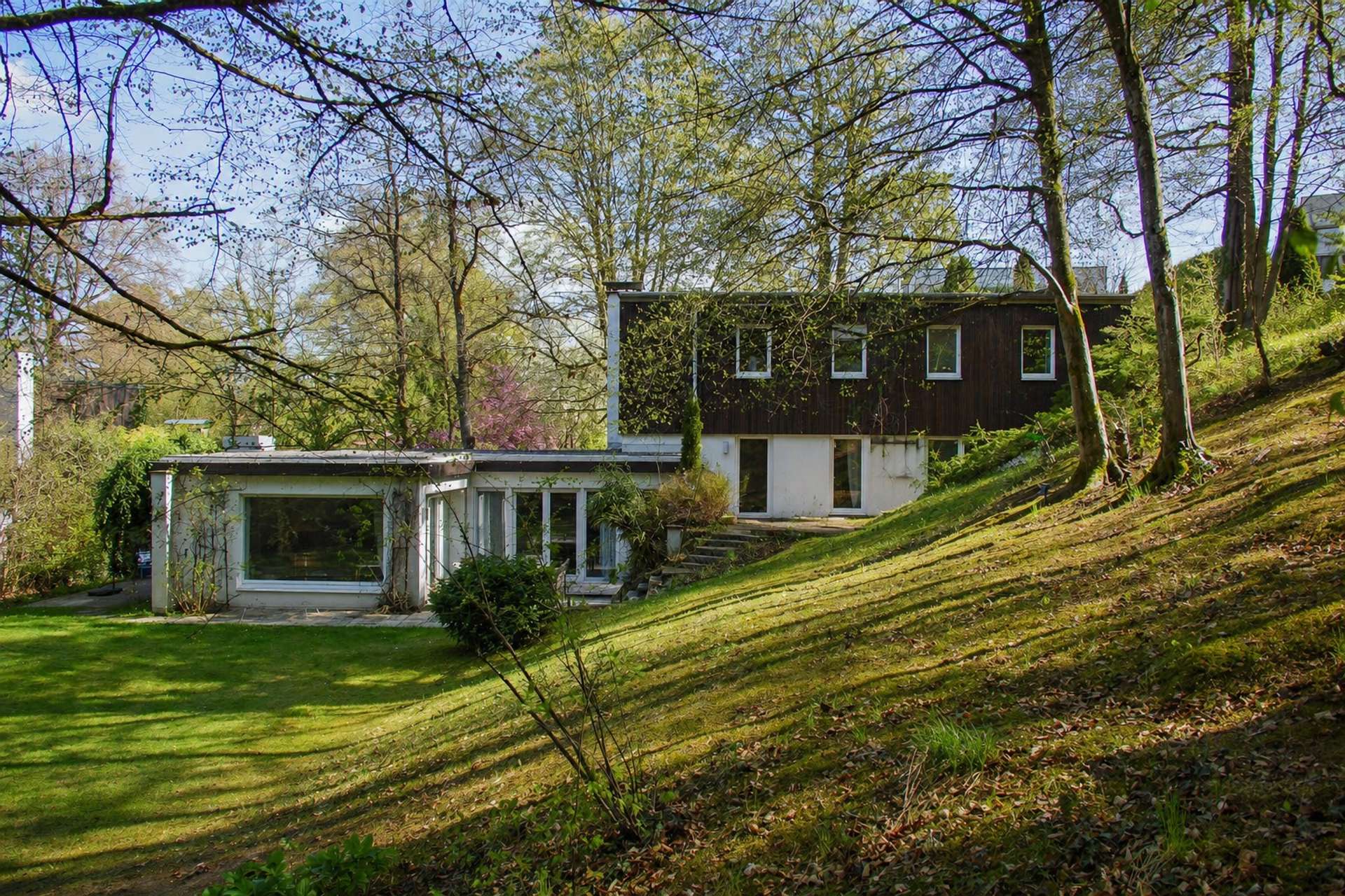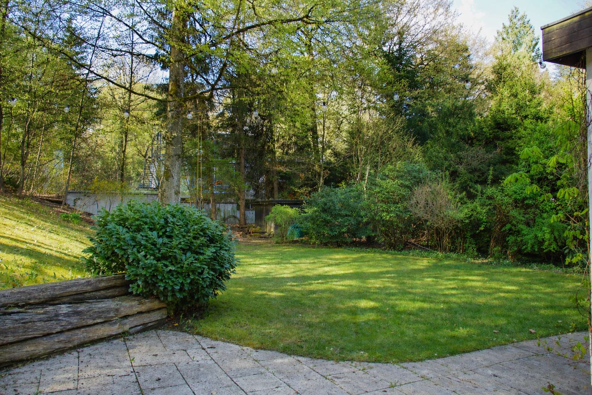 Besonders reizvoll ist die charaktervolle Topografie des Grundstücks: Die Hanglage schafft eine spannende Struktur mit verschiedenen Ebenen, Terrassen und einer besonders geschützten Atmosphäre. Gleichzeitig bietet eine großzügige, ebene Fläche ausreichend Platz für einen Garten mit Pool oder Spielfläche für Kinder. Die Ausrichtung sorgt für viel Sonne in den Nachmittags- und Abendstunden, während die Morgensonne sanft durch den Buchenhain gefiltert wird.