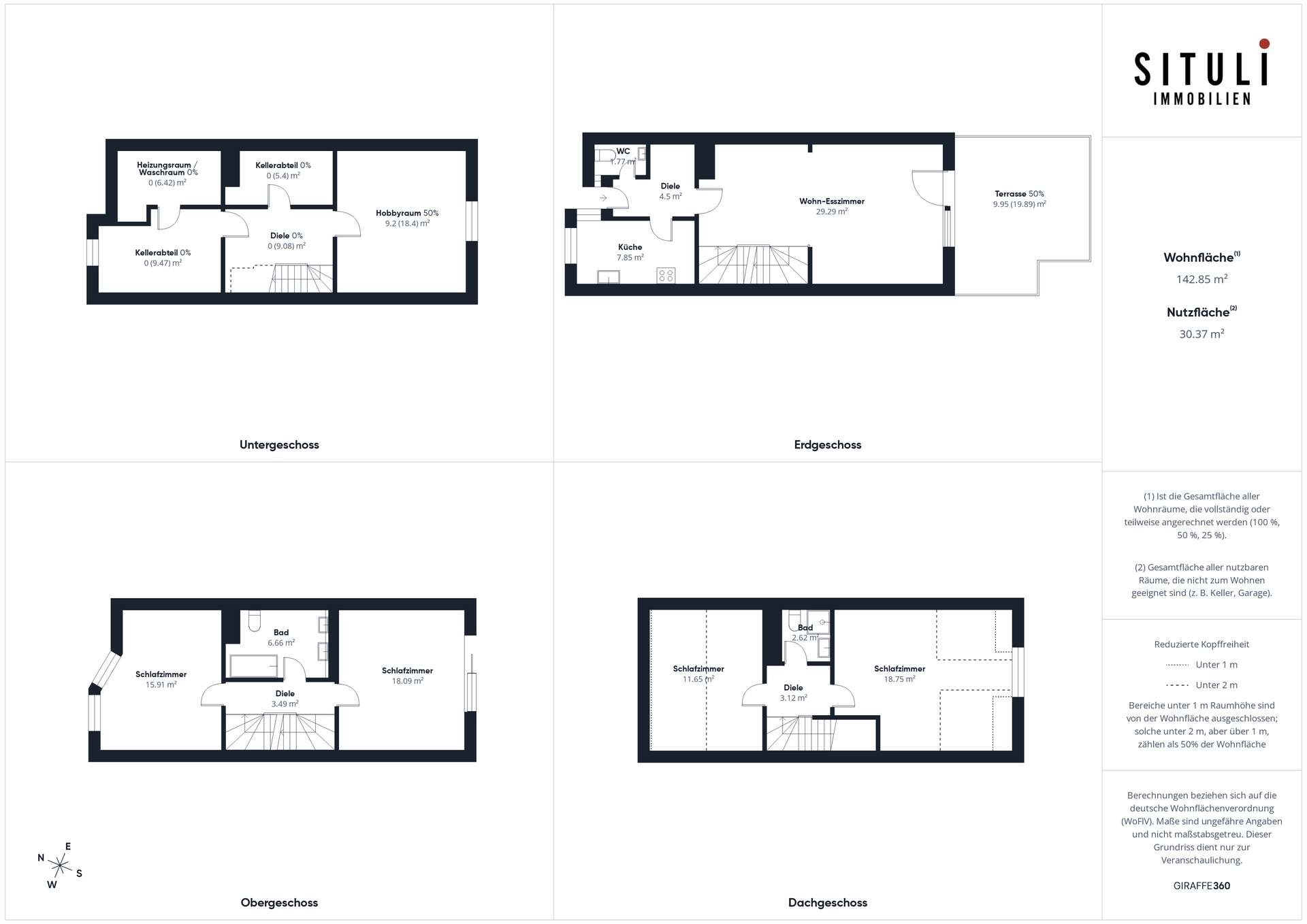 Die Wohnfläche beträgt 144 Quadratmeter. Bei der Berechnung wurden der Hobbyraum mit großem Fenster und die Terrasse jeweils mit 50 % angerechnet.