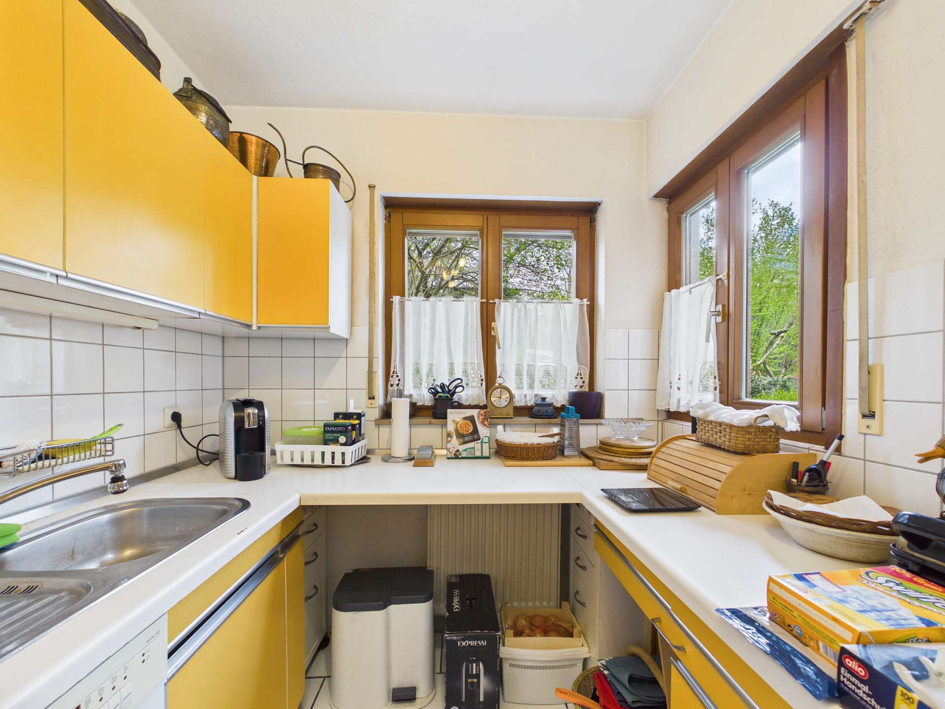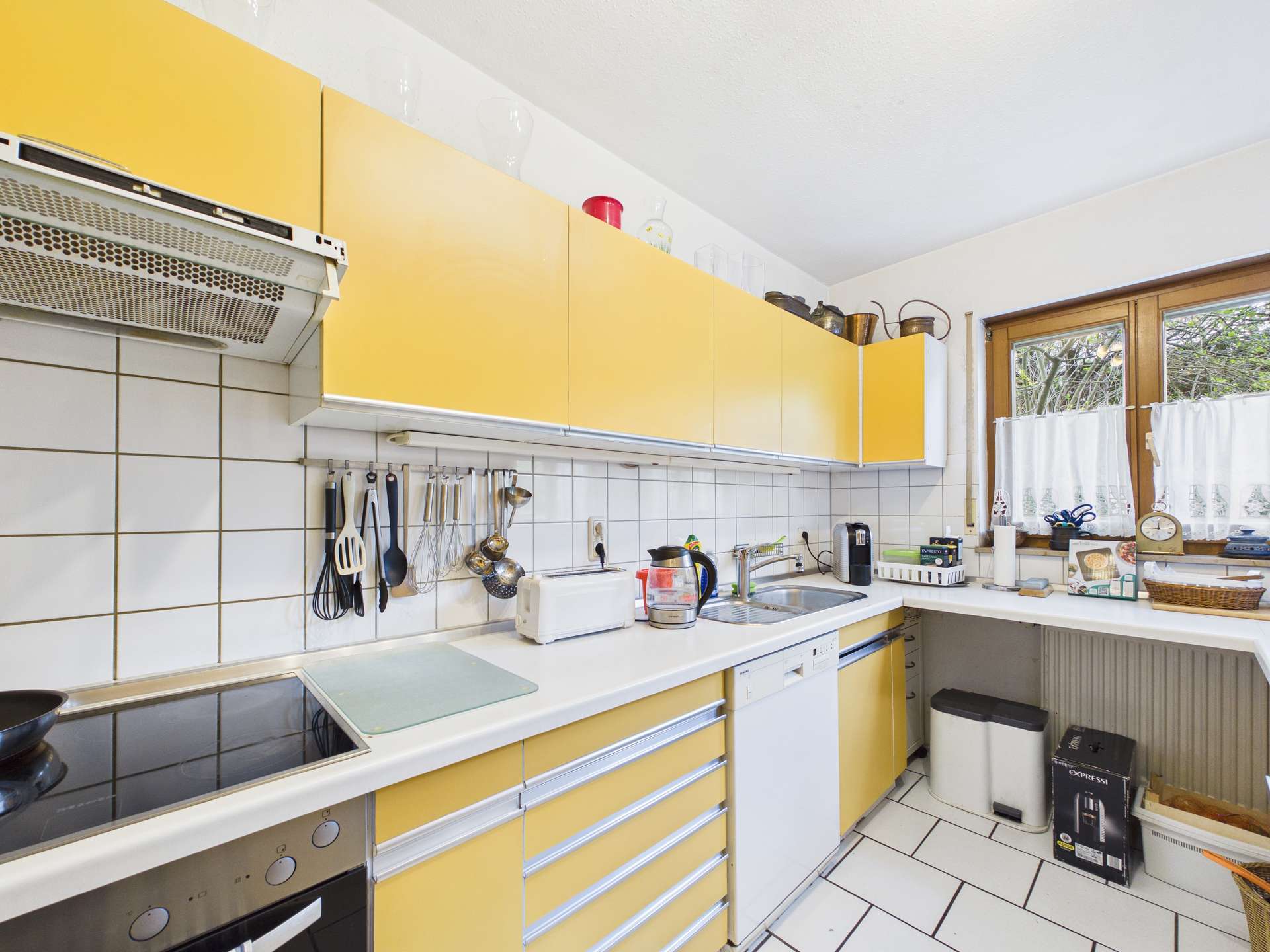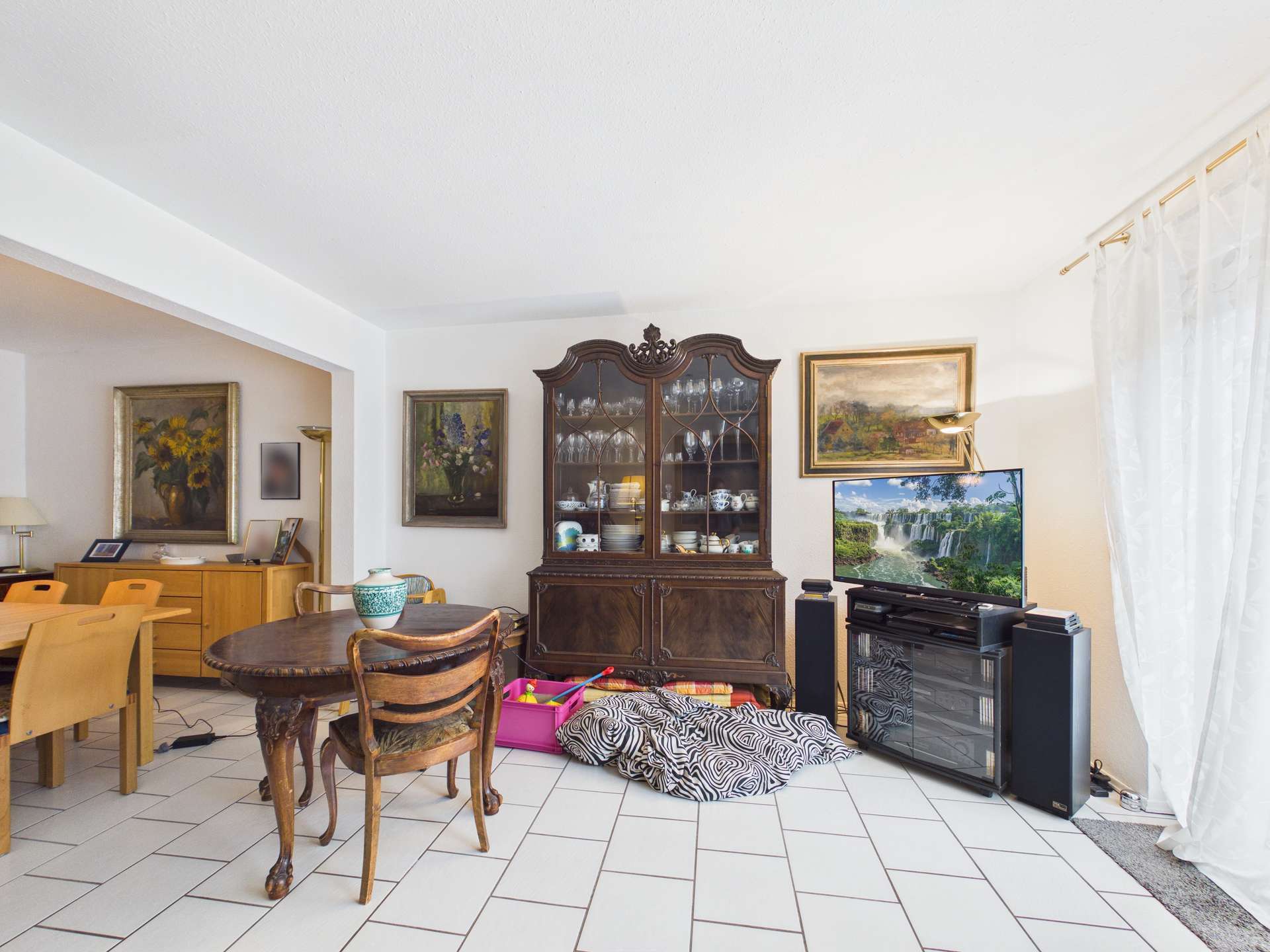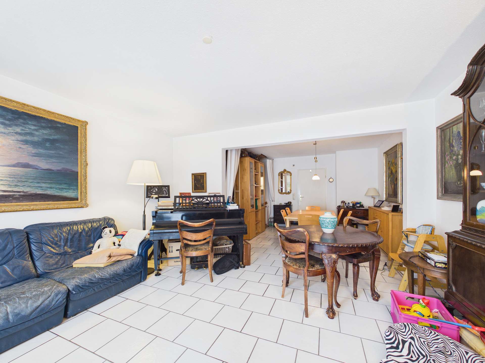 Im Erdgeschoss befindet sich eine separate Küche, ausgestattet mit einer älteren Einbauküche inklusive Elektrogeräten. Zusätzlich steht ein Gäste-WC zur Verfügung. Das Herzstück bildet das großzügige Wohn- und Esszimmer mit ca. 30 m², das durch seine Helligkeit und den direkten Zugang zur großen südlich ausgerichteten Terrasse überzeugt. Im Wohnzimmer besteht zudem die Möglichkeit, einen offenen Kamin zu realisieren. Die Böden im Erdgeschoss sind mit Fliesen ausgestattet.