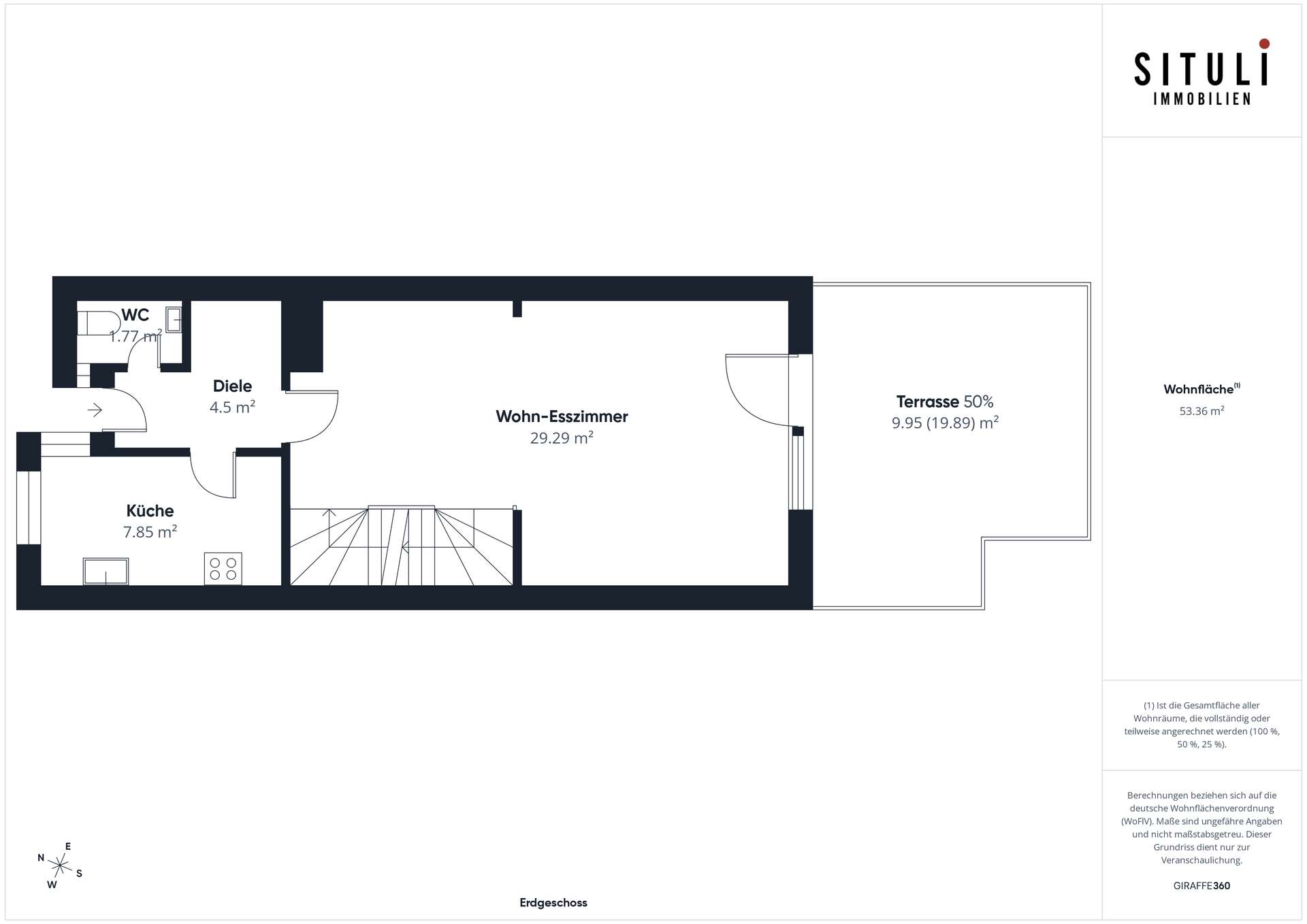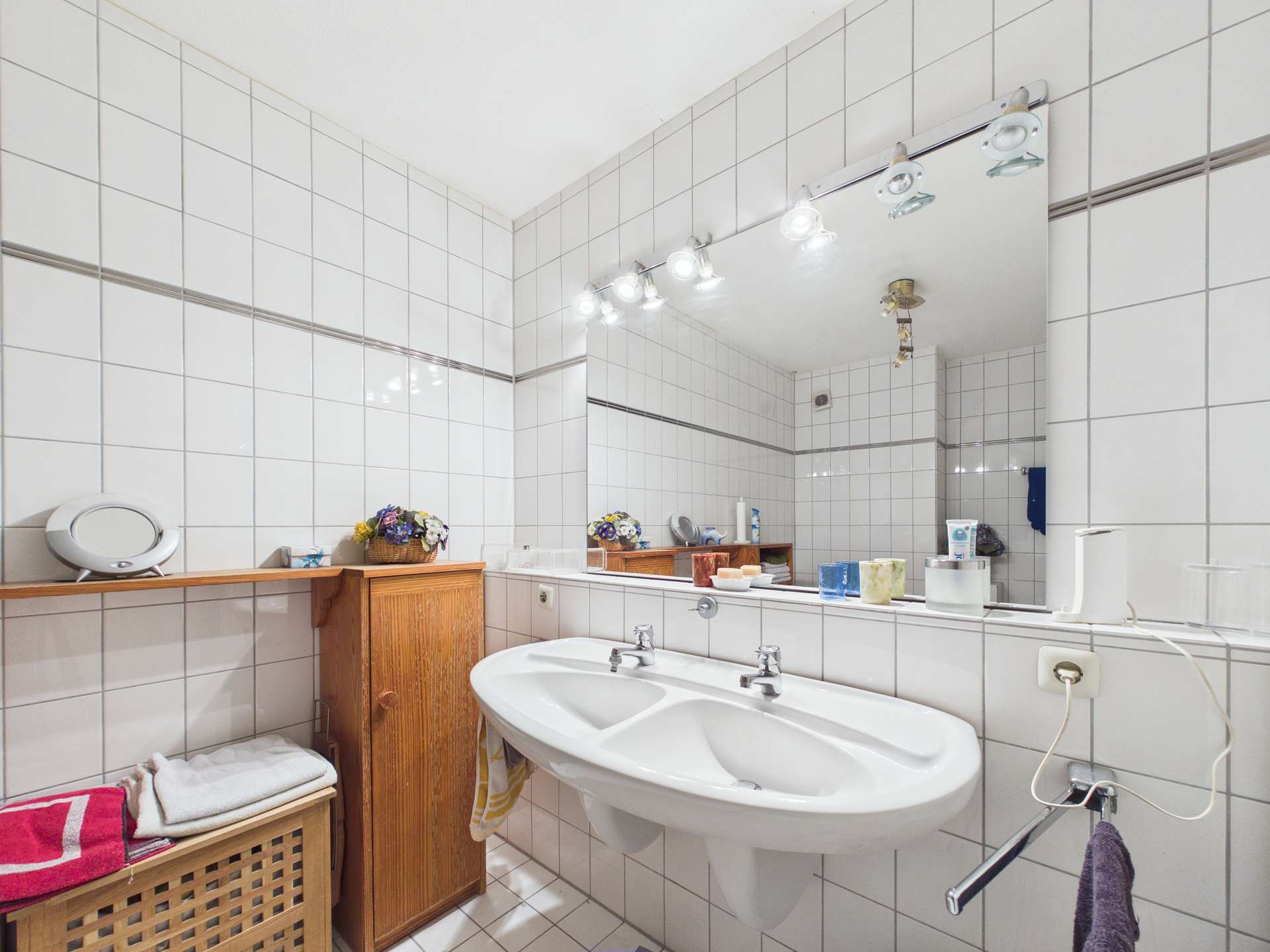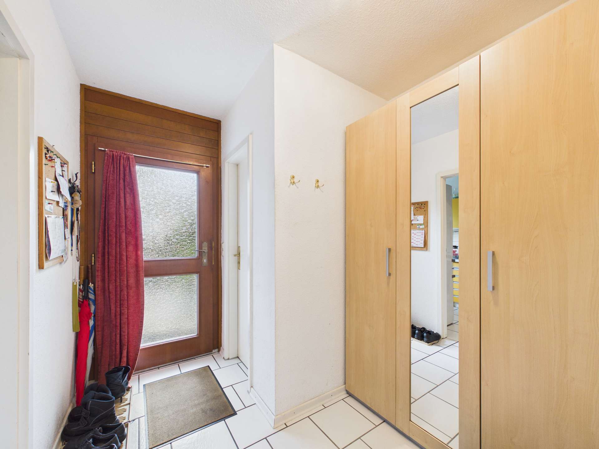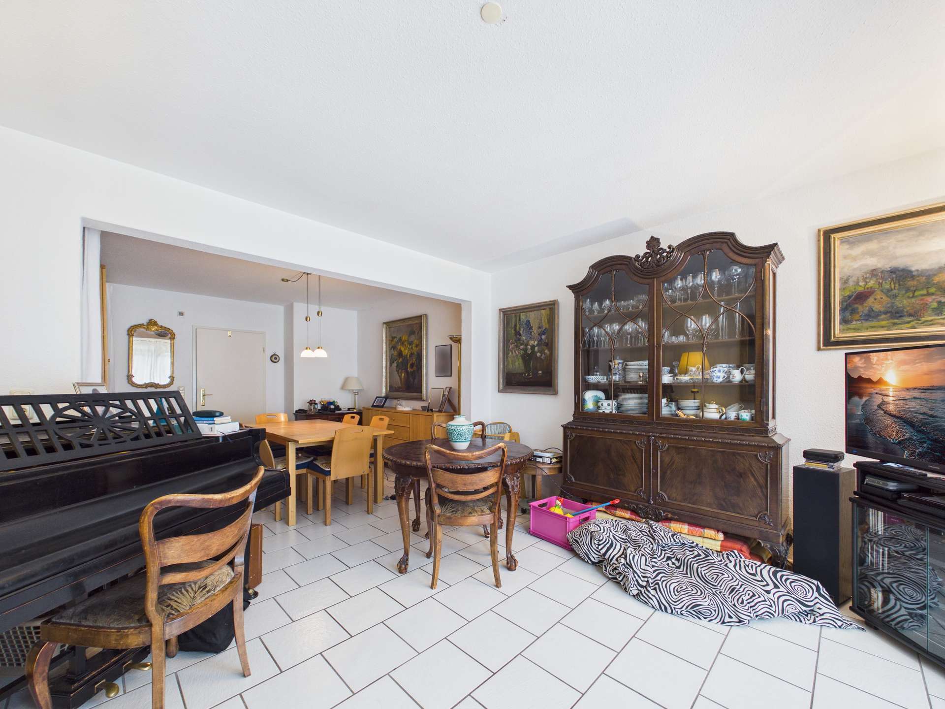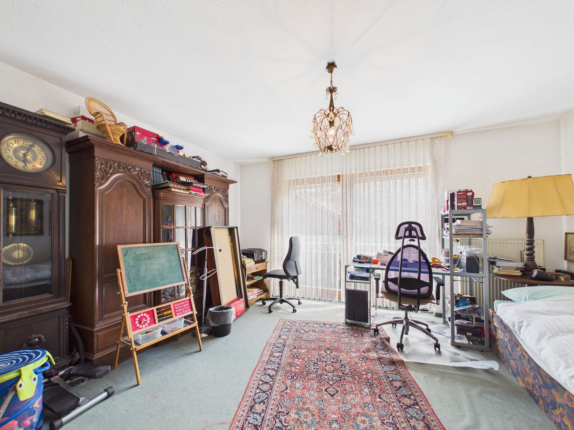 Im Erdgeschoss befindet sich eine separate Küche, ausgestattet mit einer älteren Einbauküche inklusive Elektrogeräten. Zusätzlich steht ein Gäste-WC zur Verfügung. Das Herzstück bildet das großzügige Wohn- und Esszimmer mit ca. 30 m², das durch seine Helligkeit und den direkten Zugang zur großen südlich ausgerichteten Terrasse überzeugt. Im Wohnzimmer besteht zudem die Möglichkeit, einen offenen Kamin zu realisieren. Die Böden im Erdgeschoss sind mit Fliesen ausgestattet.