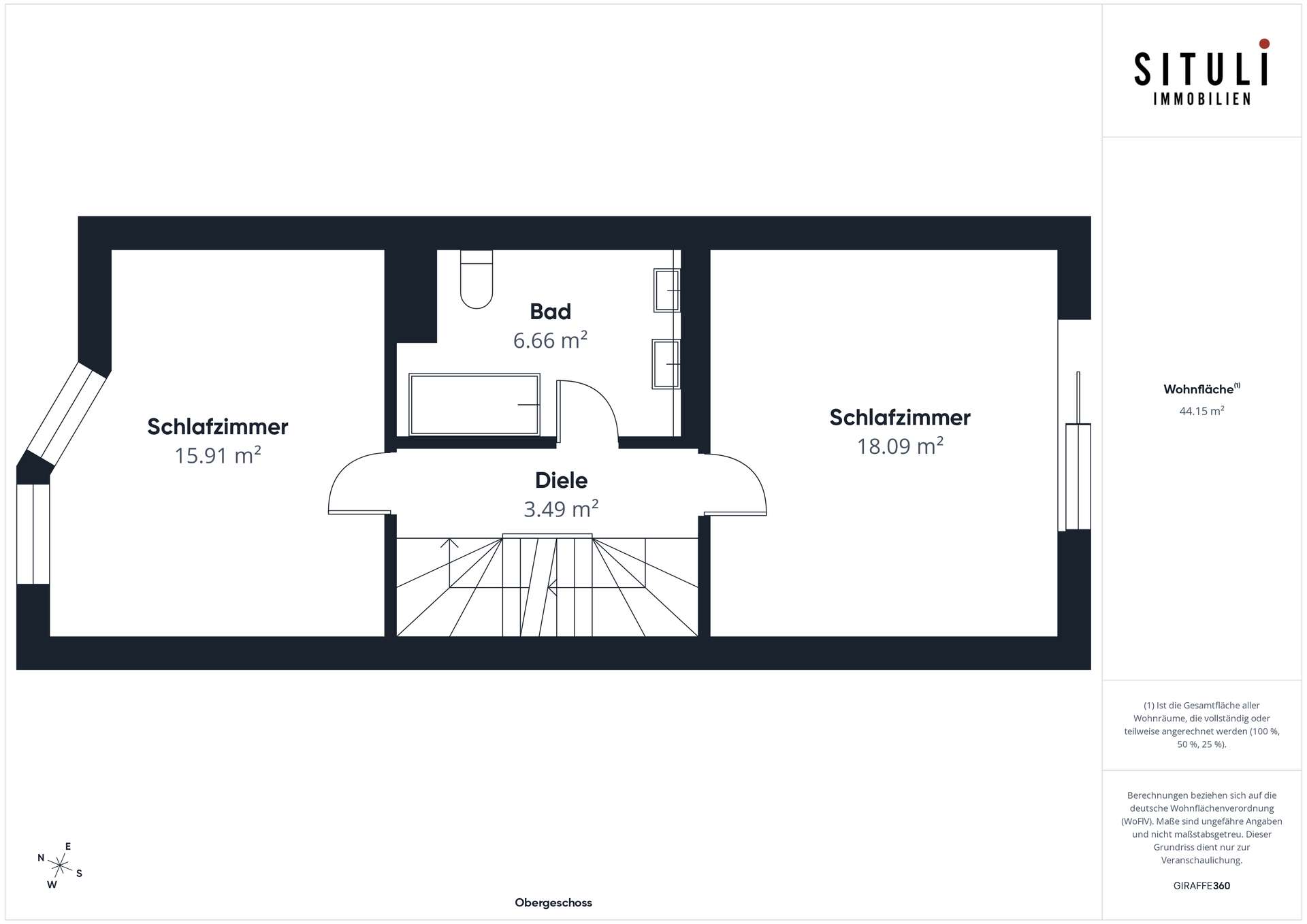 Im Obergeschoss befinden sich zwei große Schlafzimmer mit ca. 16 m² und 18 m² sowie ein Badezimmer mit Badewanne. Das größere Schlafzimmer ist nach Süden ausgerichtet und verfügt über einen kleinen französischen Balkon. Die Schlafzimmer sind mit Teppichboden ausgestattet, das Badezimmer ist gefliest.