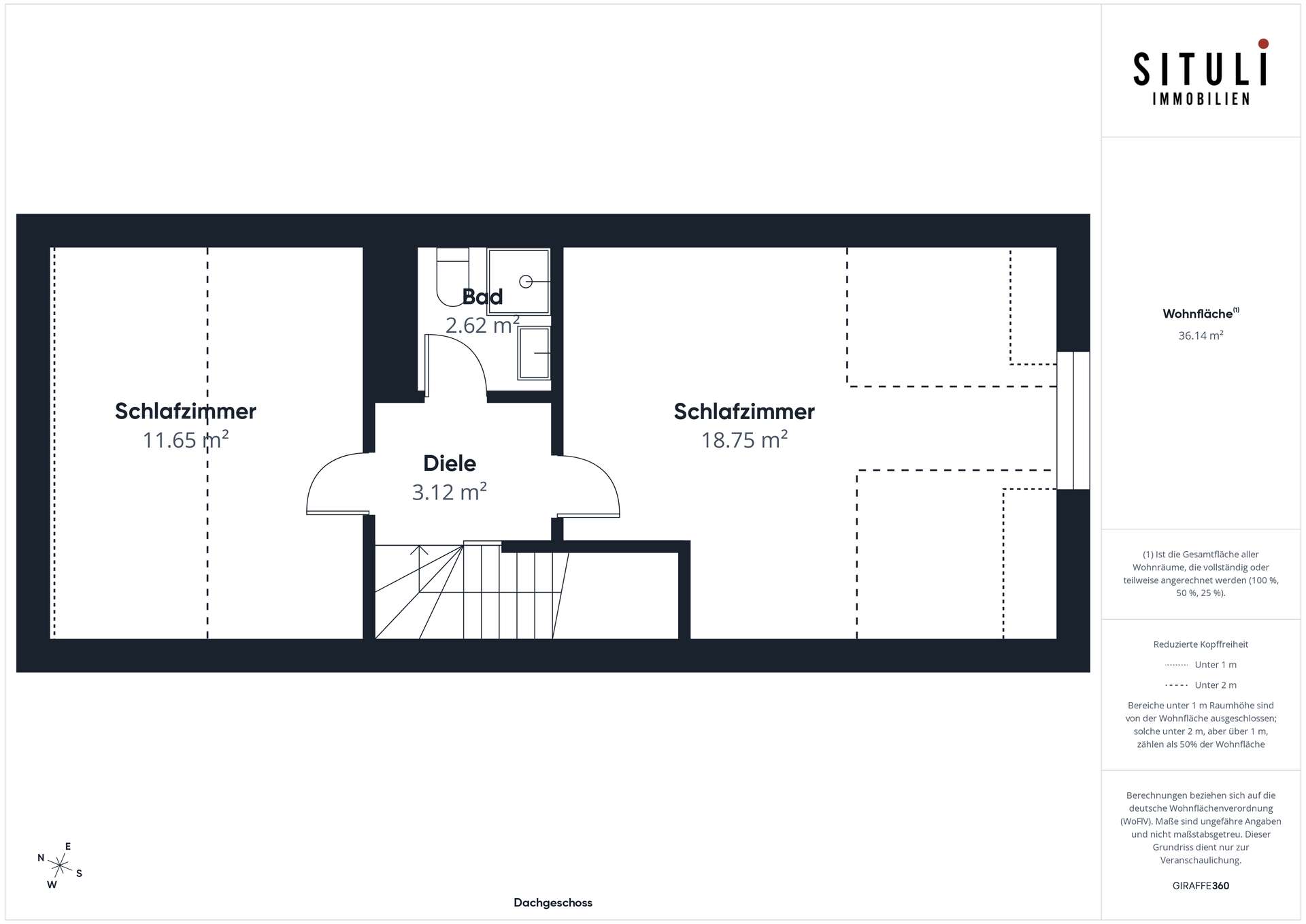 Im Dachgeschoss stehen ein weiteres Schlafzimmer mit ca. 12 m² sowie ein weiteres Zimmer mit ca. 18 m² zur Verfügung, ergänzt durch ein Badezimmer mit Dusche. Auch hier ist Teppichboden verlegt. Zusätzlich gibt es einen großzügigen Speicherbereich, in dem man teilweise in Körperhöhe stehen kann.