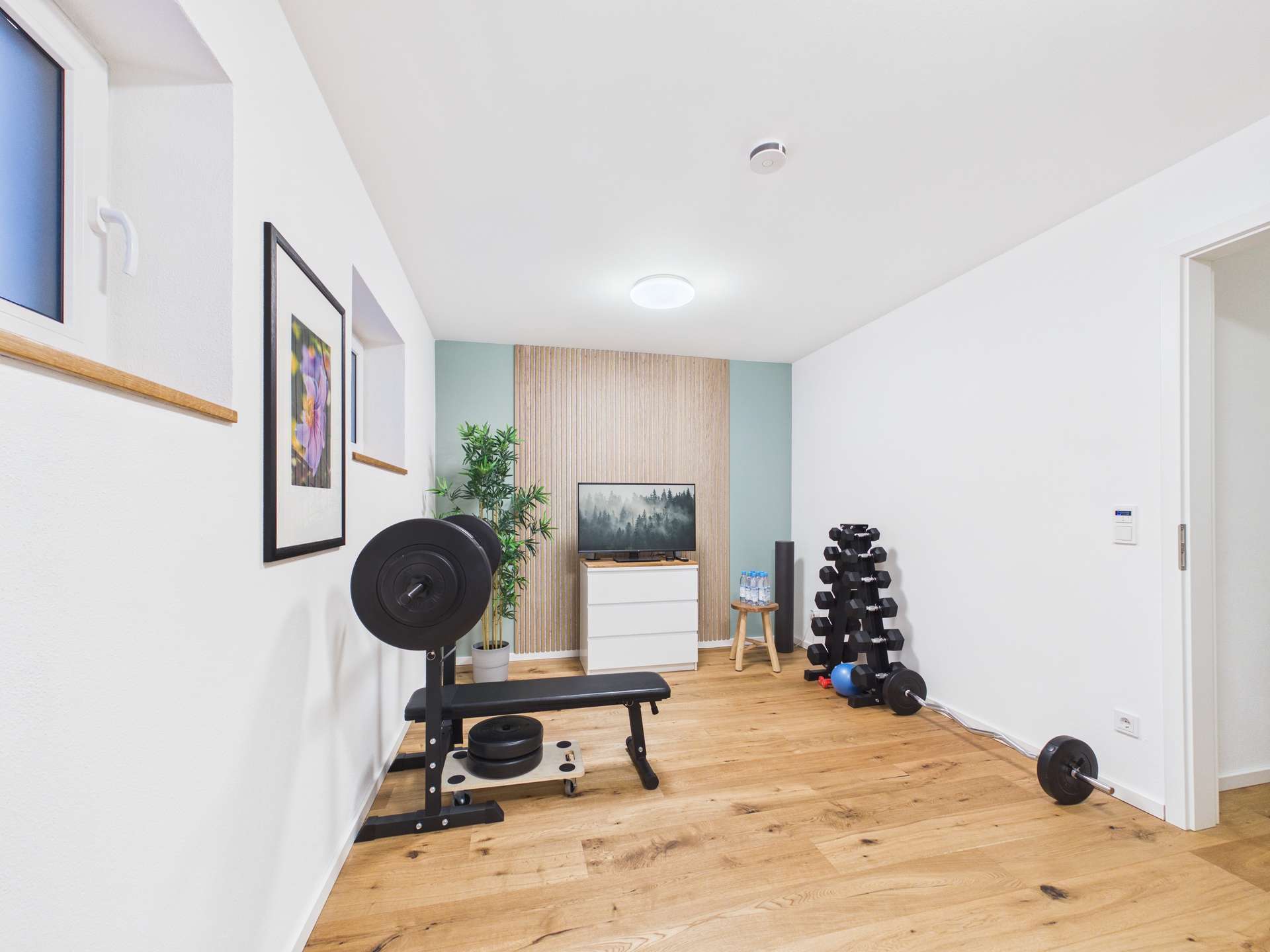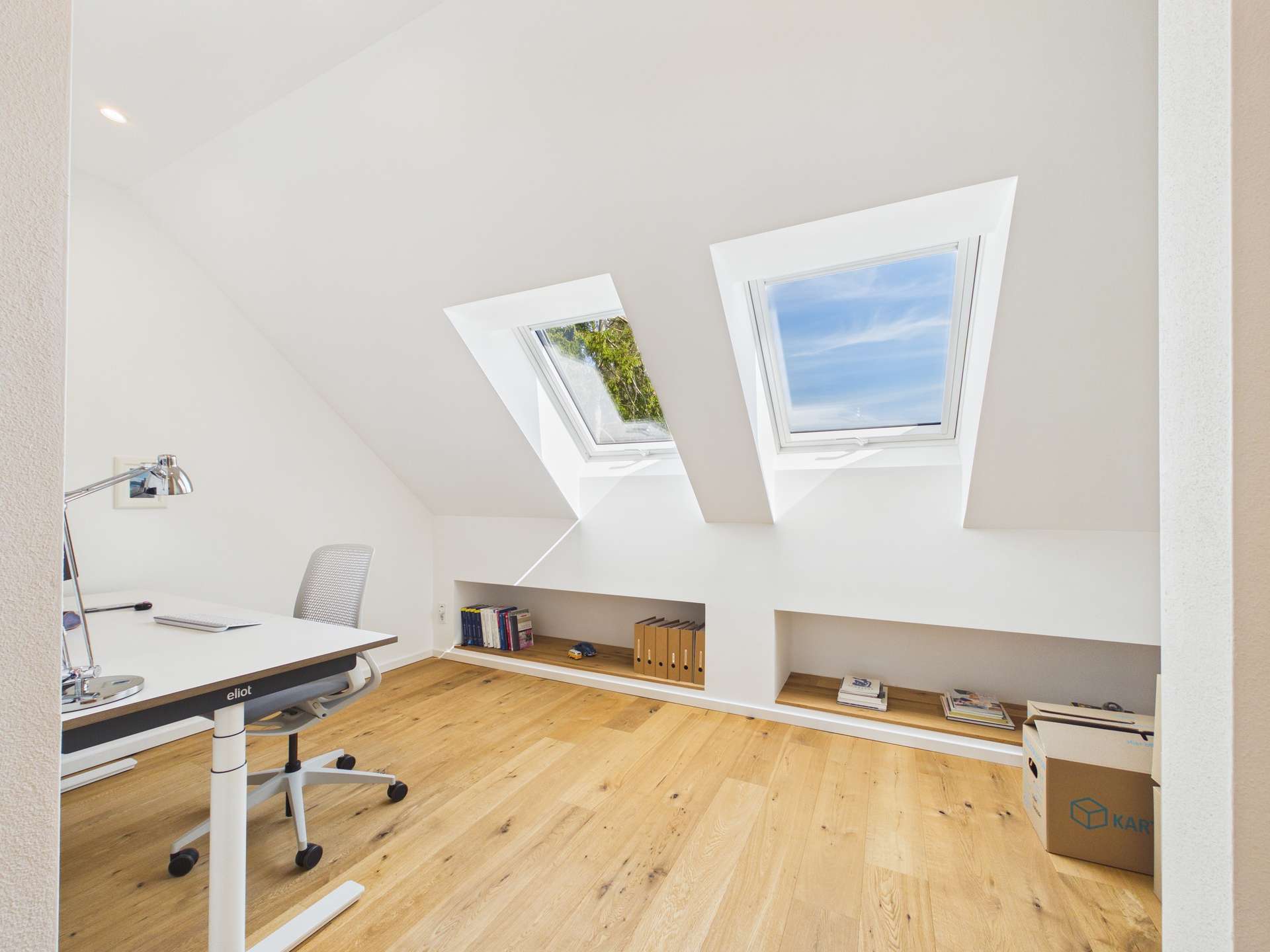 Das Erdgeschoss präsentiert sich mit einer offen gestalteten, hochwertigen Küche, einem großzügigen Essbereich und einem einladenden Wohnzimmer. Von hier aus besteht direkter Zugang zur nach Südwesten ausgerichteten Terrasse, die ideale Voraussetzungen für sonnige Stunden im Freien bietet. Im 1. Obergeschoss befinden sich das Elternschlafzimmer, ein Badezimmer mit Badewanne und Dusche sowie ein weiteres Zimmer, das flexibel genutzt werden kann. Das Dachgeschoss bietet ein Kinderzimmer sowie einen offenen Arbeitsbereich, der sich bei Bedarf unkompliziert in ein zusätzliches, separates Zimmer abtrennen lässt. Ergänzt wird diese Ebene durch ein weiteres Badezimmer mit Dusche. Im Untergeschoss stehen ein von innen zusätzlich gedämmter Hobbyraum, der Technikraum sowie ein praktischer Kellerraum zur Lagerung von Getränken und Lebensmitteln zur Verfügung.
