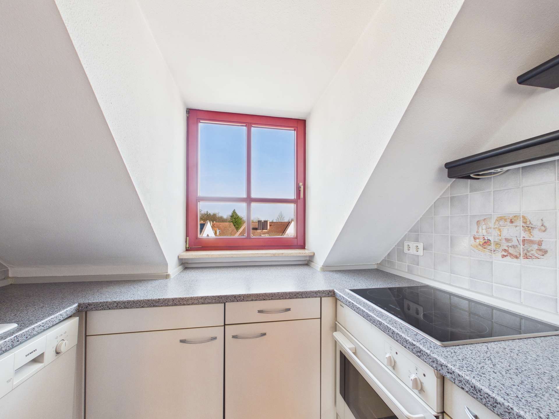 Die hochwertige Einbauküche ist bereits vorhanden und ermöglicht einen sofortige Einzug ohne aufwendige Zusatzinvestitionen. Dank des charakteristischen Dachgeschossflairs mit seinen geneigten Decken und besonderen Lichtverhältnissen entsteht eine einzigartige, wohnliche Atmosphäre, die diese Wohnung von anderen abhebt.