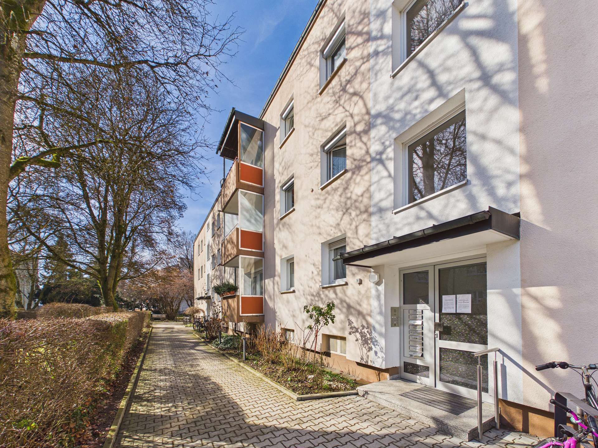 Zur Wohnanlage mit insgesamt 15 Wohnungen gehören 5 gemeinschaftliche Stellplätze, die den Bewohnern zur Verfügung stehen. Ein ca. 10 Quadratmeter großes Kellerabteil bietet zusätzlichen Stauraum.