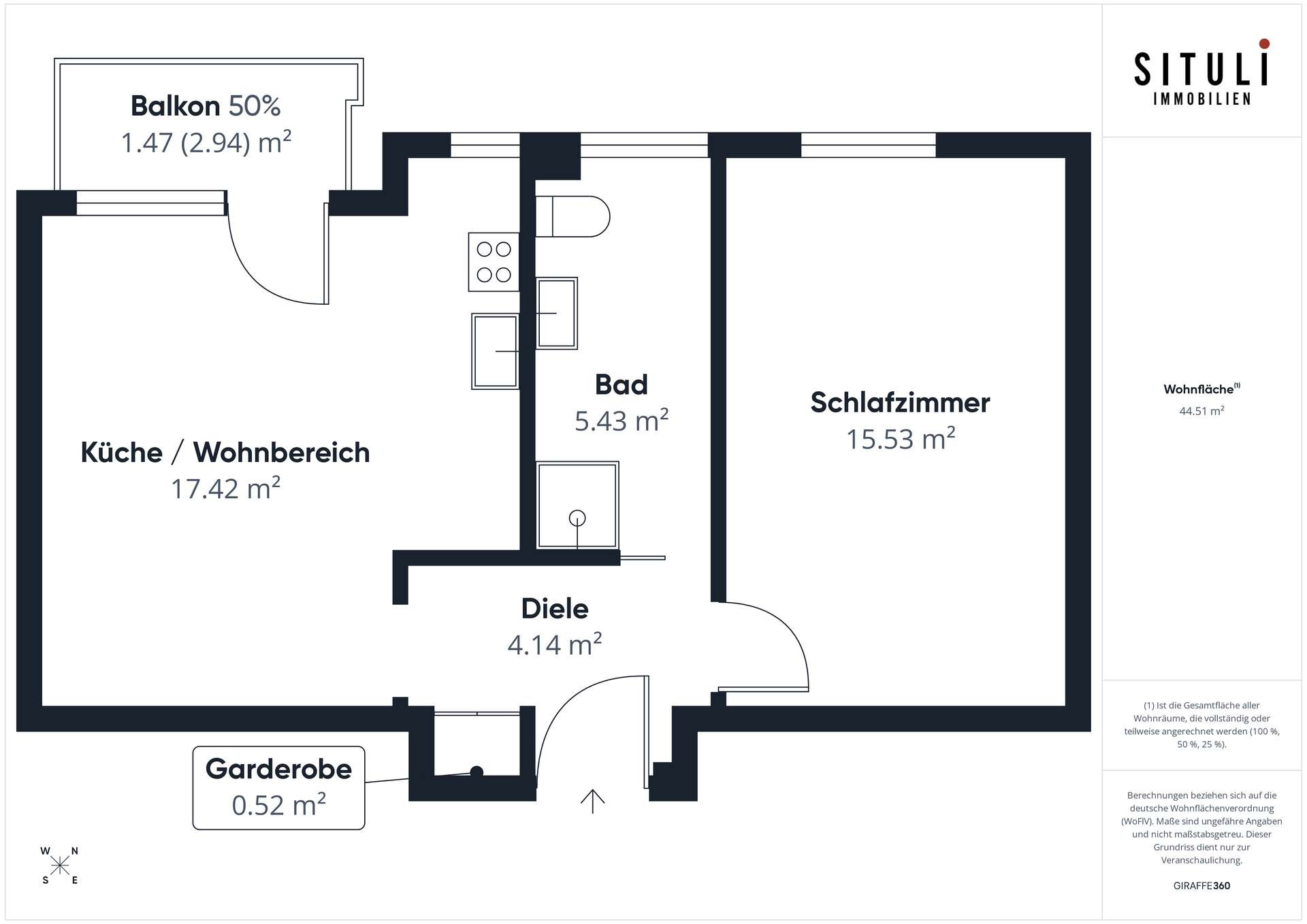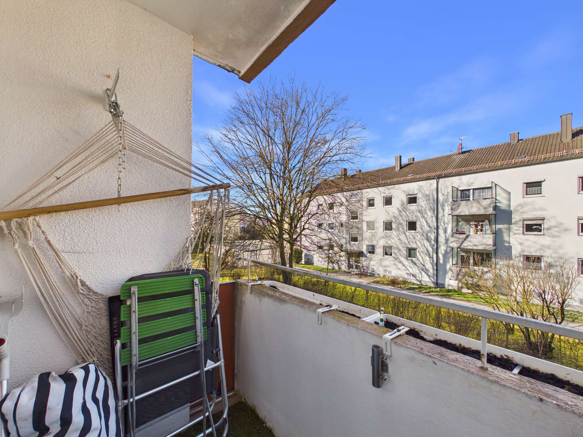 Der praktische Grundriss bietet ein helles Wohn- und Esszimmer mit Zugang zum westlich ausgerichteten Balkon, auf dem sich insbesondere die Nachmittags- und Abendstunden angenehm genießen lassen. Das Schlafzimmer ist gut geschnitten und ermöglicht eine praktische Möblierung. Das Badezimmer ist funktional gestaltet und hat ein großes Fenster.
