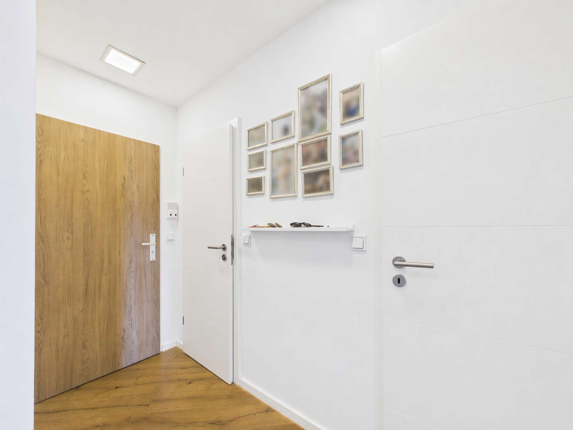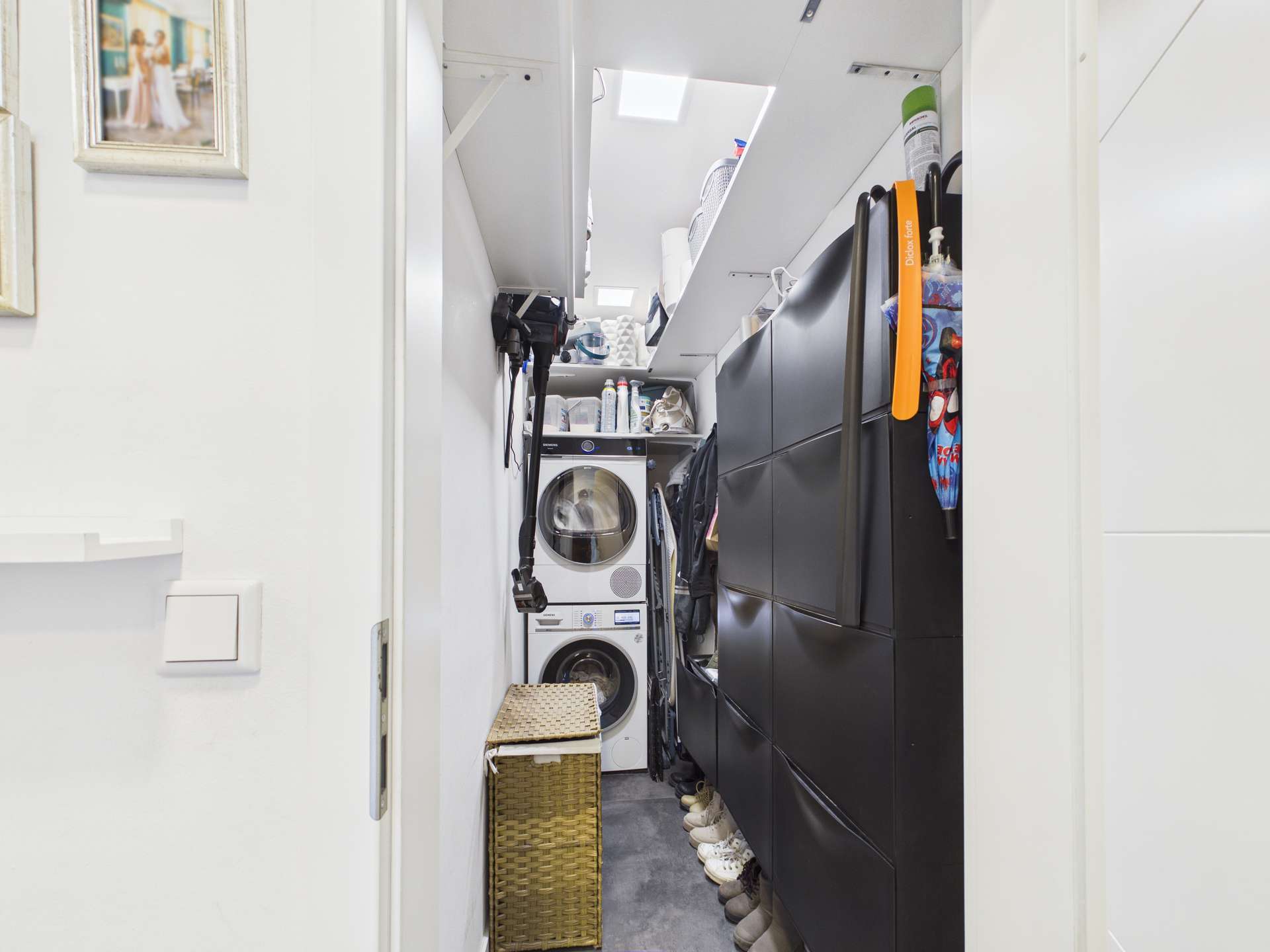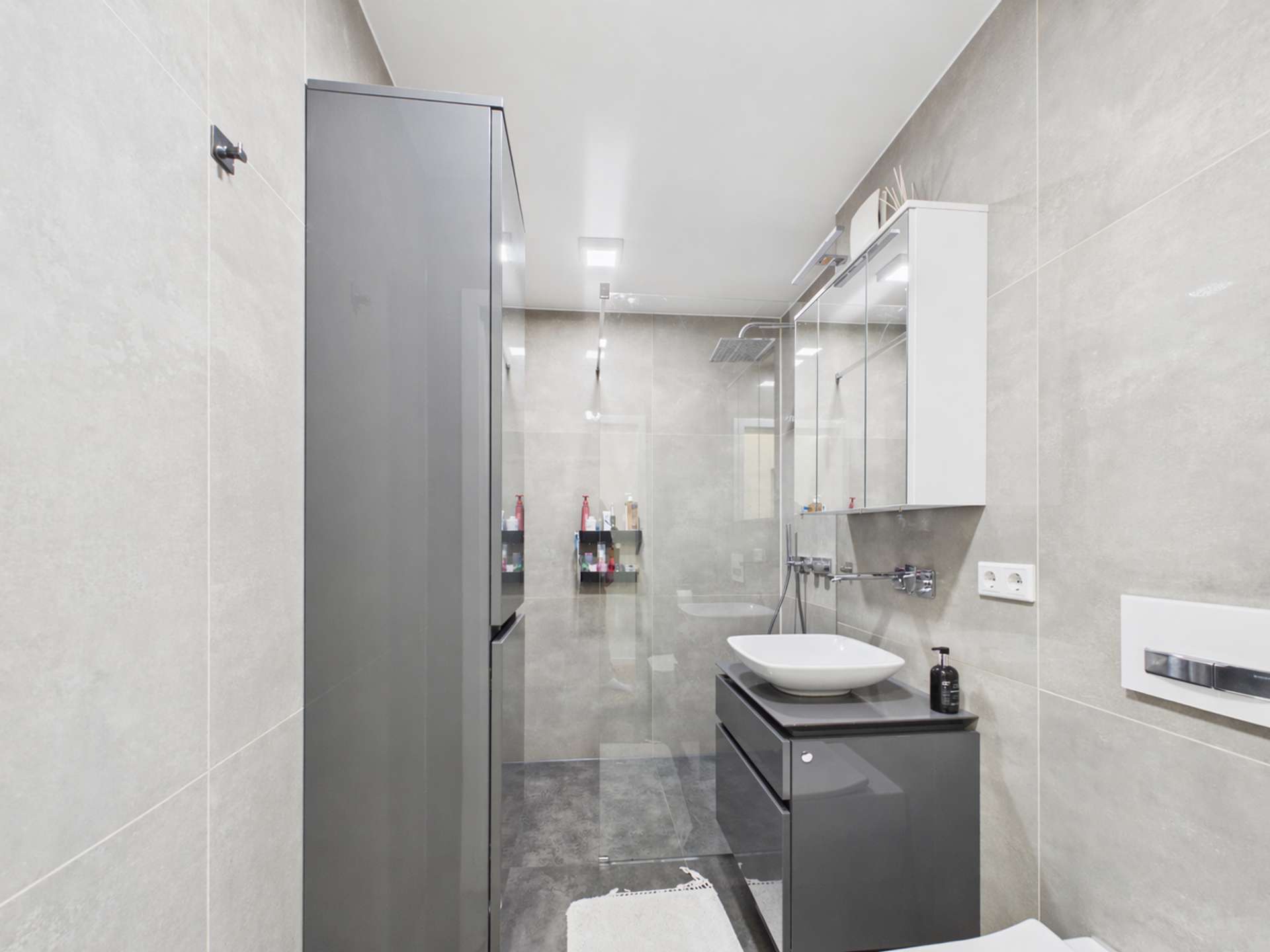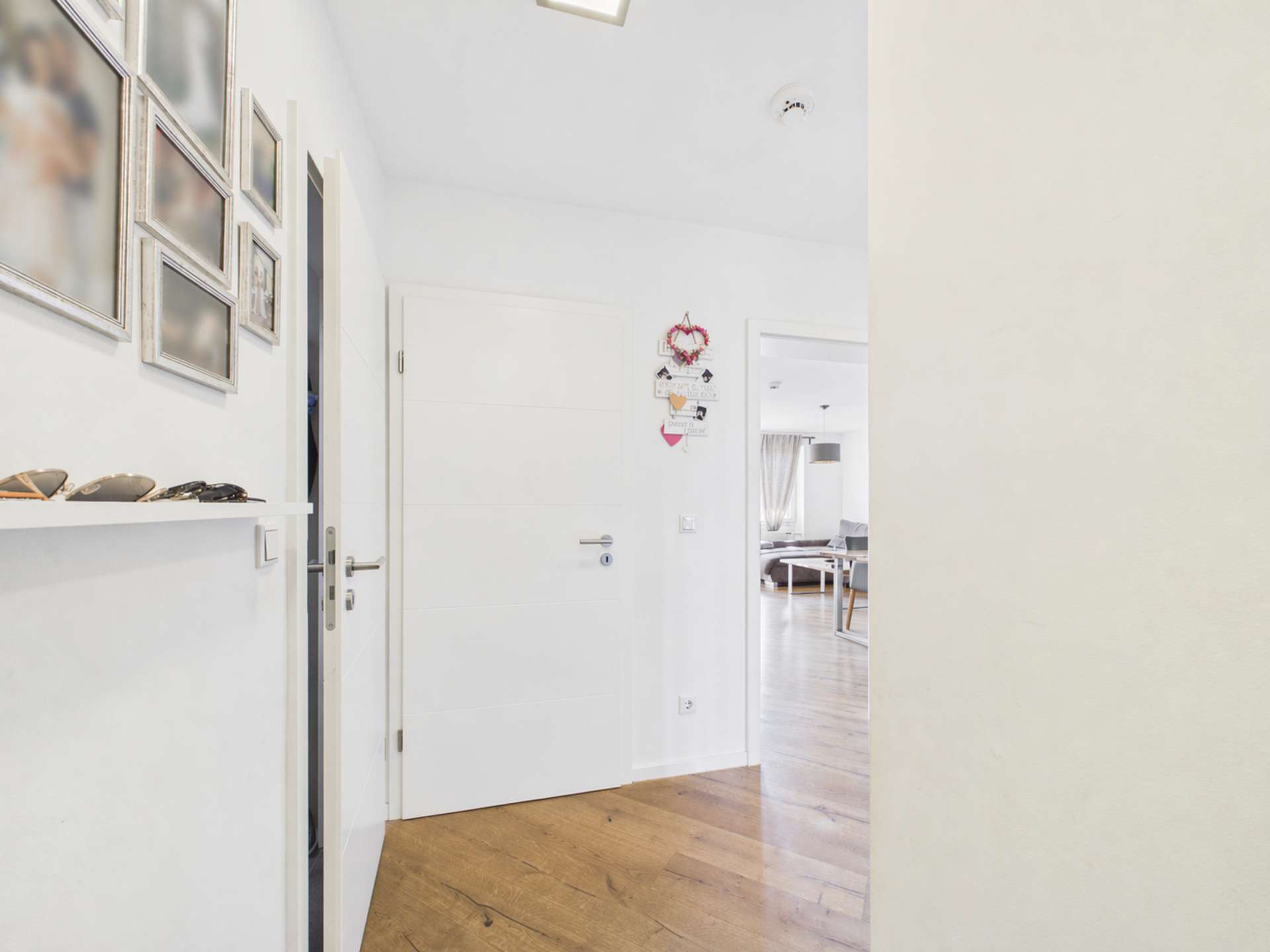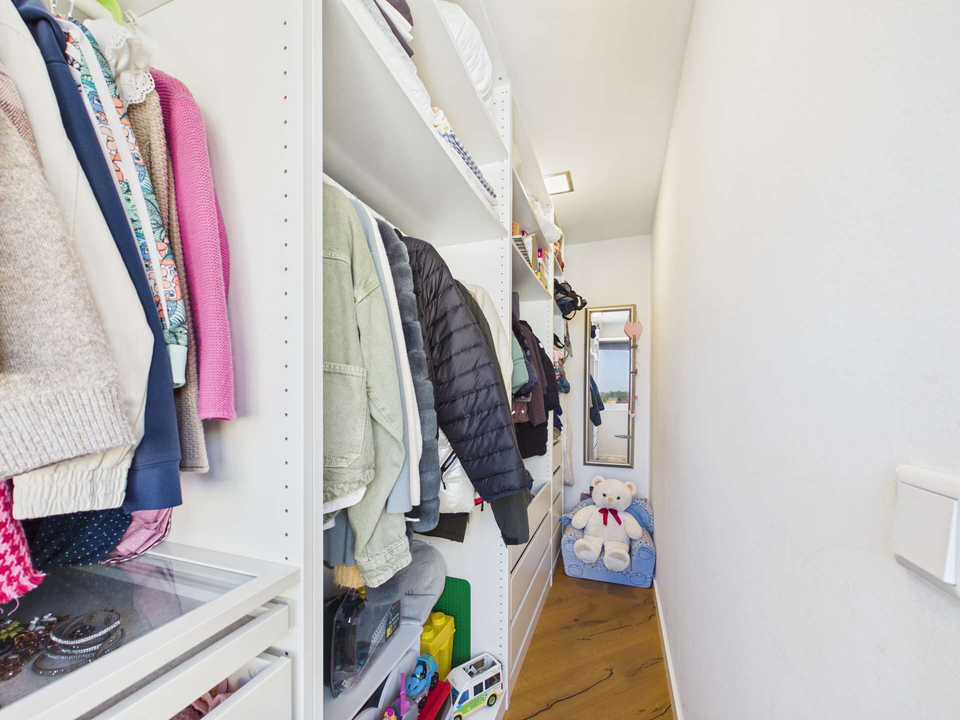 Die Wohnung verfügt zudem über zwei Schlafzimmer: ein kleineres Zimmer sowie ein großzügiges Hauptschlafzimmer mit einem begehbaren Kleiderschrank, der durch eine Trockenbauwand elegant vom Schlafbereich abgetrennt ist.